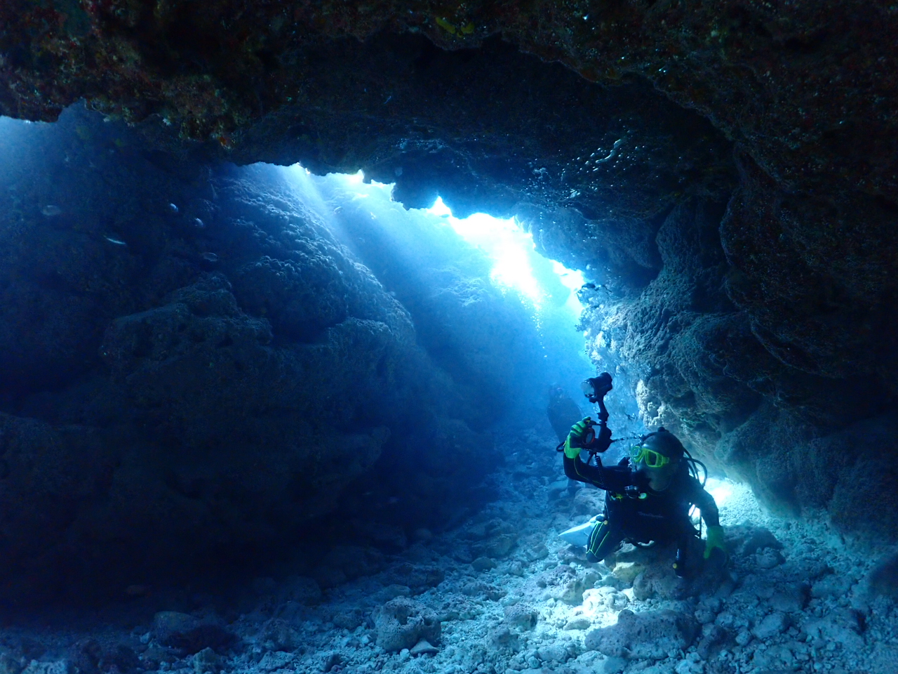 宮古島はサンゴが隆起してできた島なので、海の中は特異な形状になっていて、多くの洞窟もあります。
